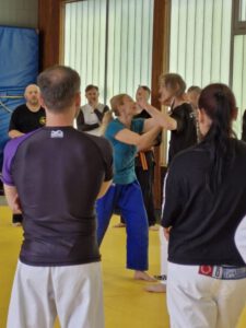 29 Teilnehmer – vom 5. Kyu bis zum 6. Dan – stellten sich der Herausforderung, die Jens mitgebracht hatte: Ein Crossover aus klassischem Ju-Jutsu und philippinischen Waffenkampf-Konzepten.